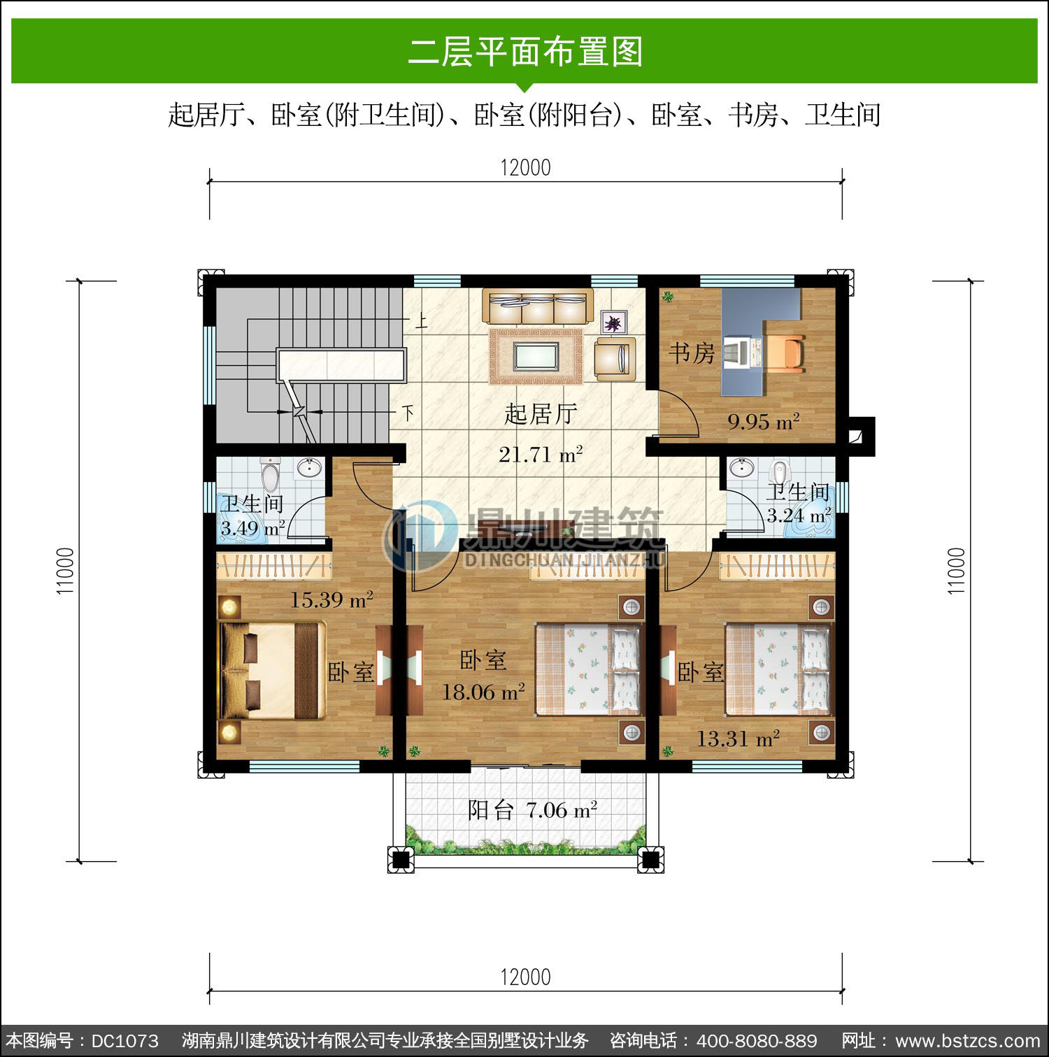 二 層: 起居廳、臥室(附衛(wèi)生間)、臥室(附陽臺)、臥室、書房、衛(wèi)生間
