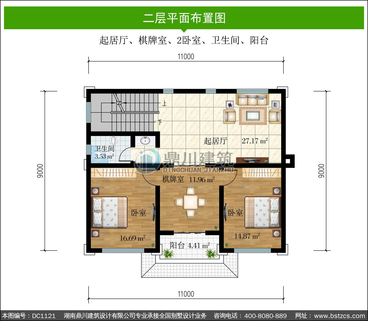 二 層: 起居廳、棋牌室、2臥室、衛(wèi)生間、陽臺(tái)