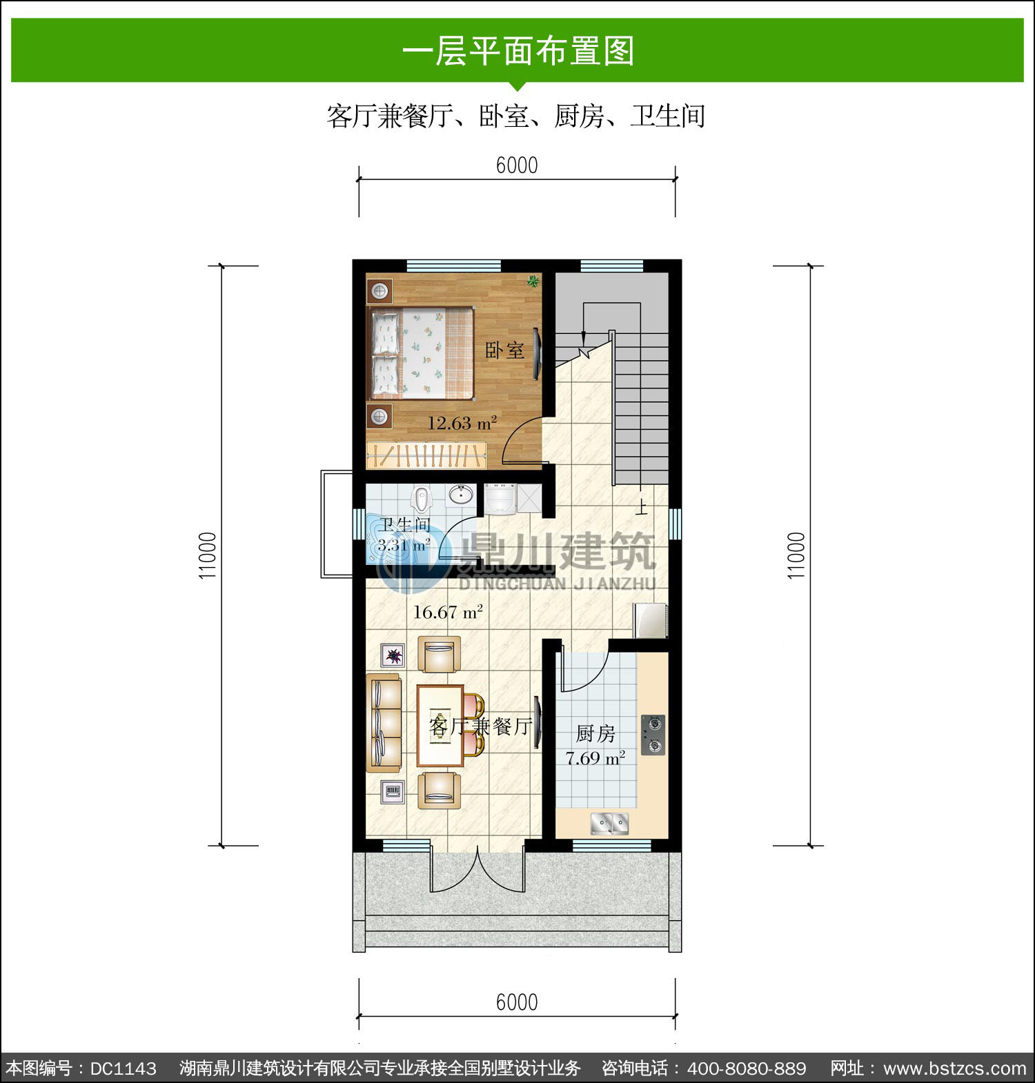 一 層: 客廳兼餐廳、臥室、廚房、衛(wèi)生間