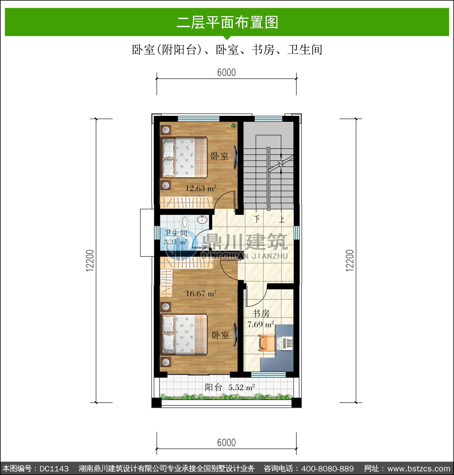 二 層: 臥室(附陽臺)、臥室、書房、衛(wèi)生間