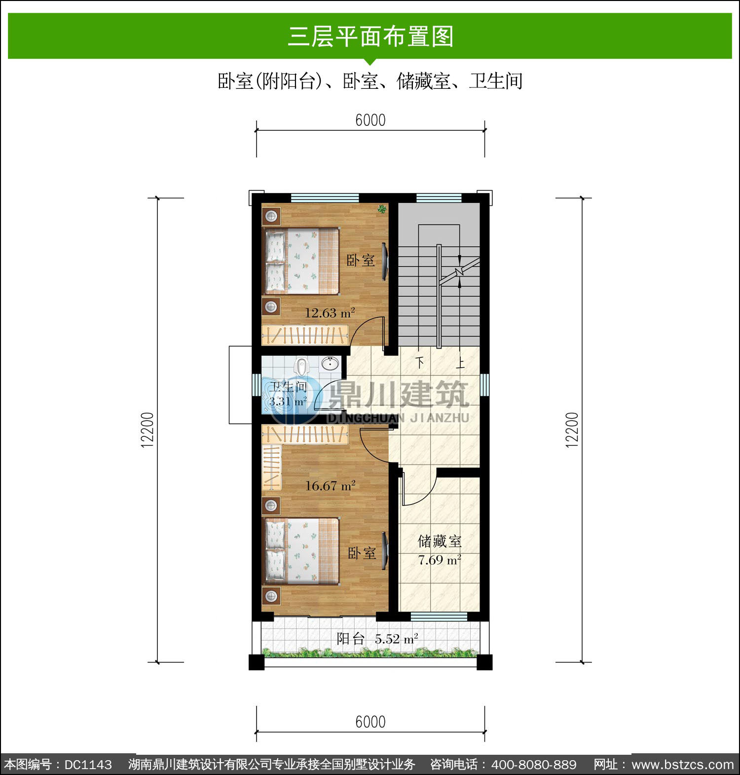 三 層: 臥室(附陽臺)、臥室、儲藏室、衛(wèi)生間
