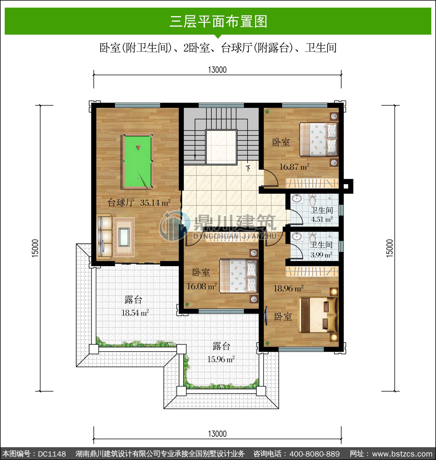 | 三 層: | 臥室(附衛(wèi)生間)、2臥室、臺球廳(附露臺)、衛(wèi)生間 | |||
