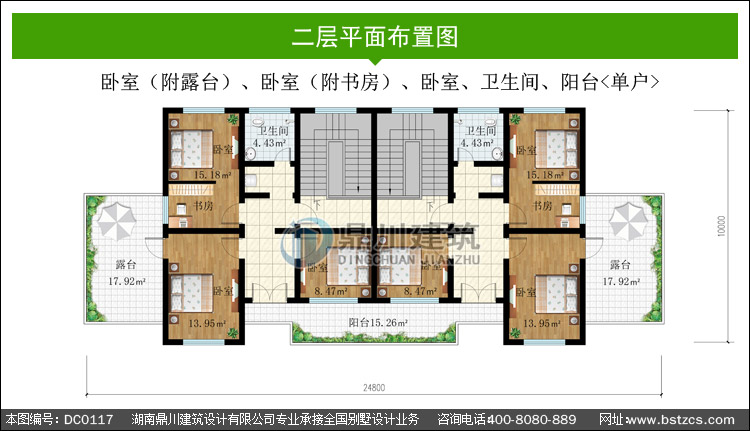 | 二 層: | 臥室(附露臺(tái))、臥室(附書房)、臥室、衛(wèi)生間、陽(yáng)臺(tái) | |||