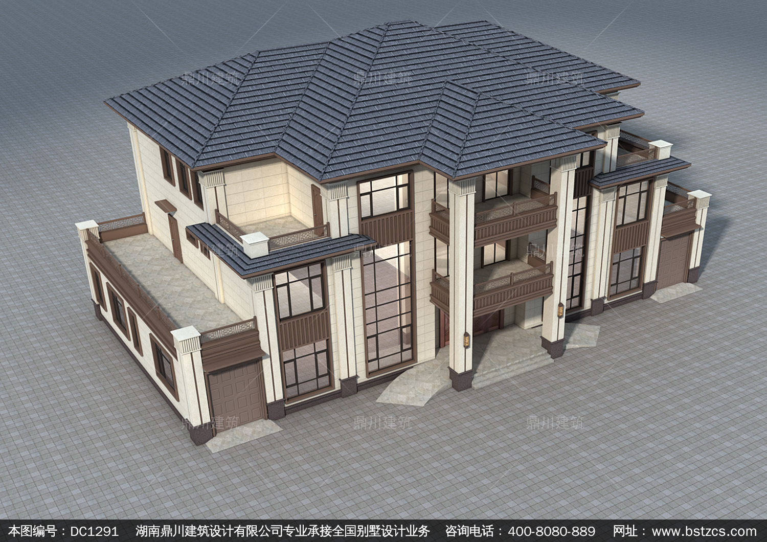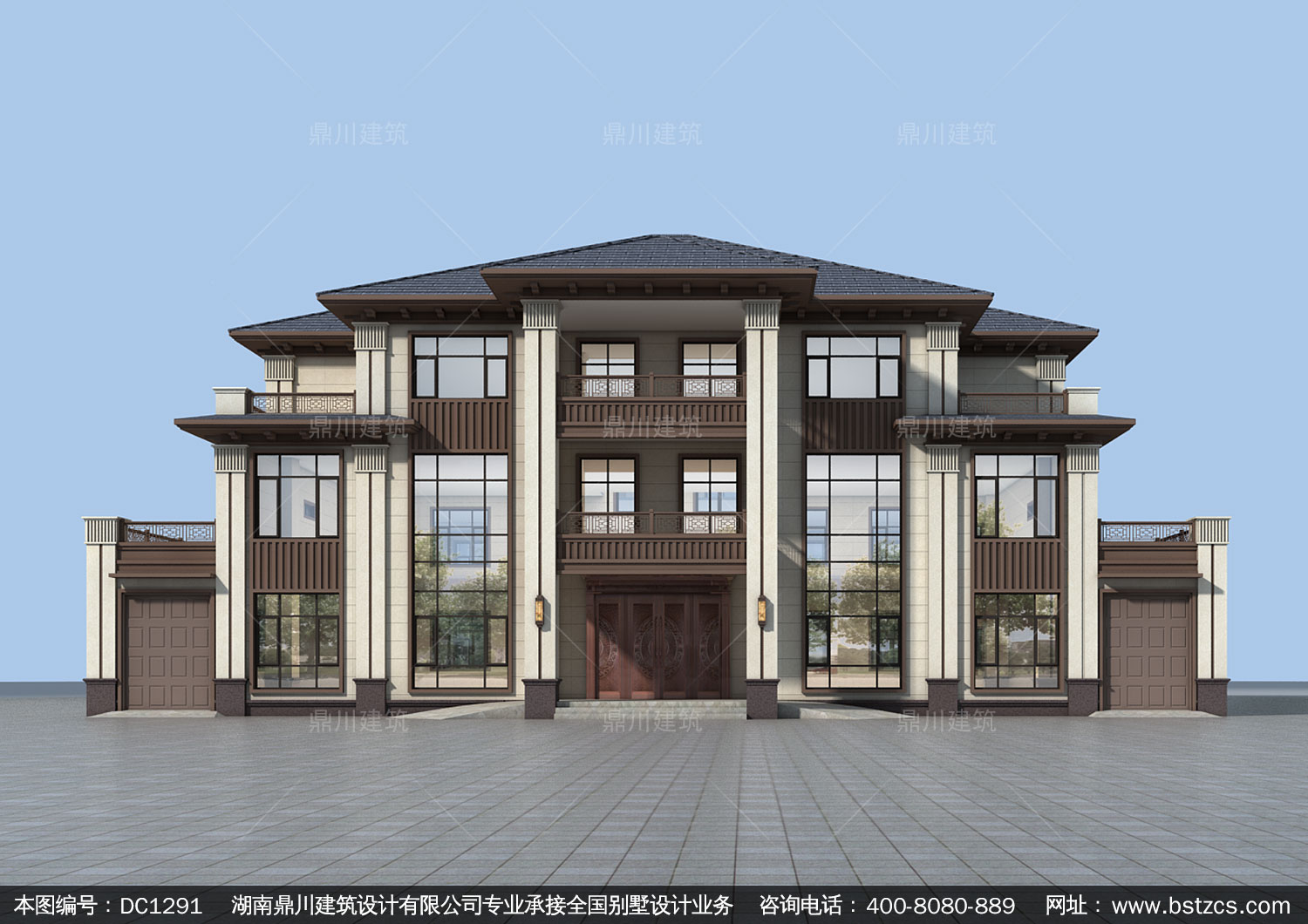 大氣新中式三層雙拼別墅圖紙及效果圖_農(nóng)村自建別墅設計,鼎川建