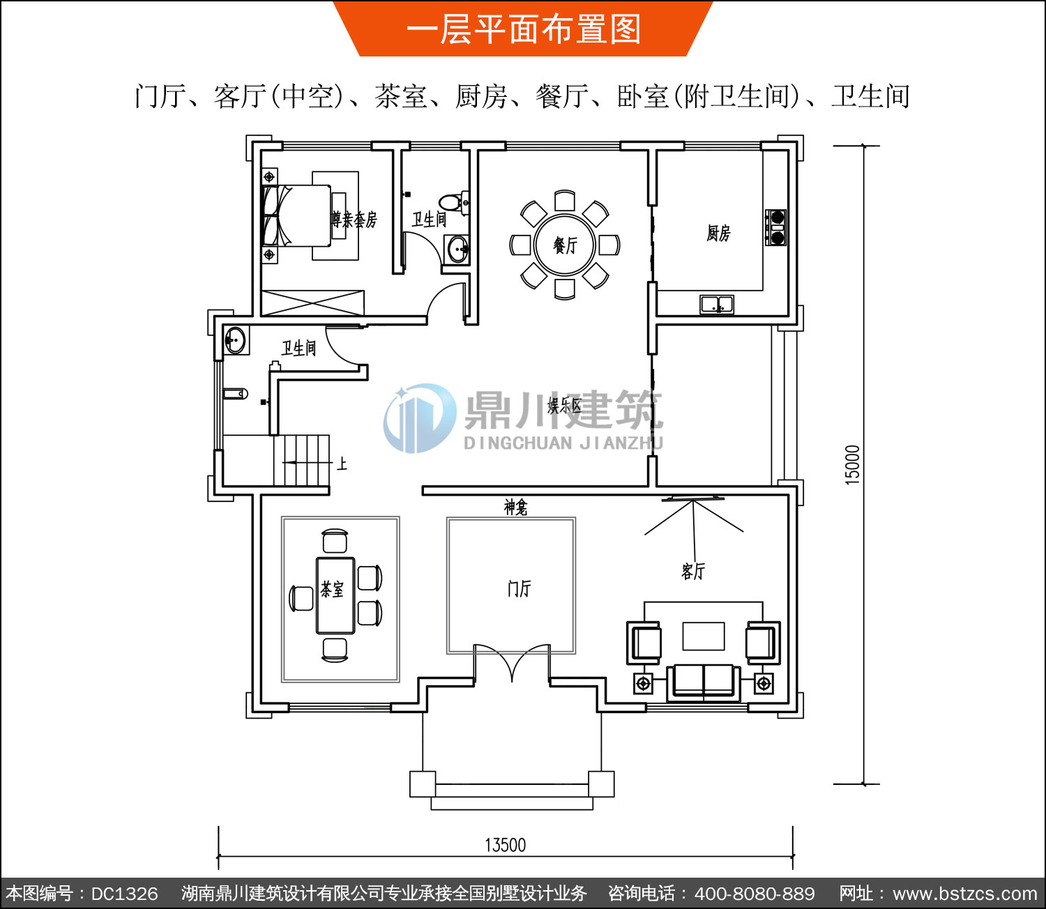 一 層: 門廳、客廳(中空)、茶室、廚房、餐廳、臥室(附衛(wèi)生間)、衛(wèi)生間