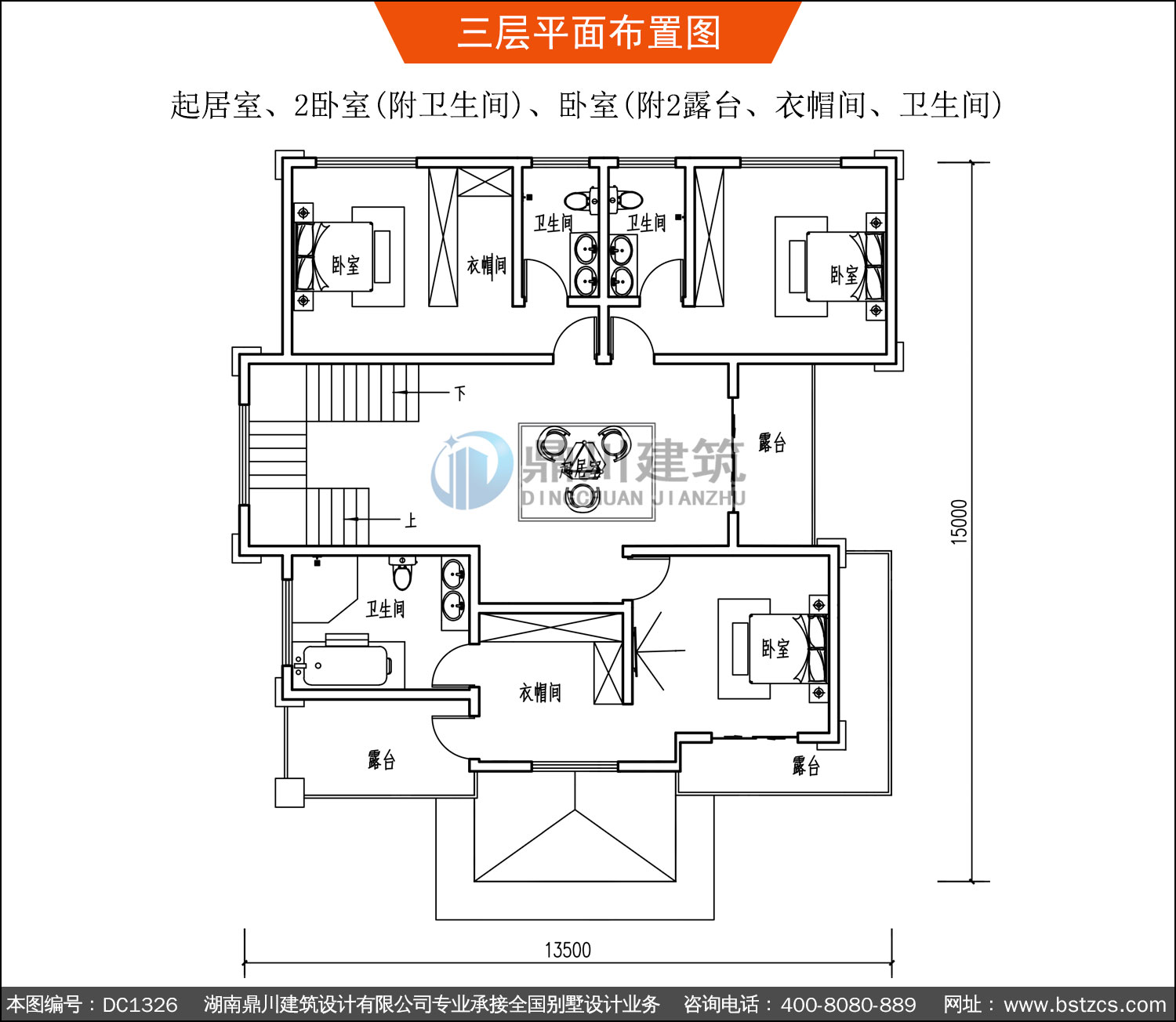 三 層: 起居室、2臥室(附衛(wèi)生間)、臥室(附2露臺、衣帽間、衛(wèi)生間)