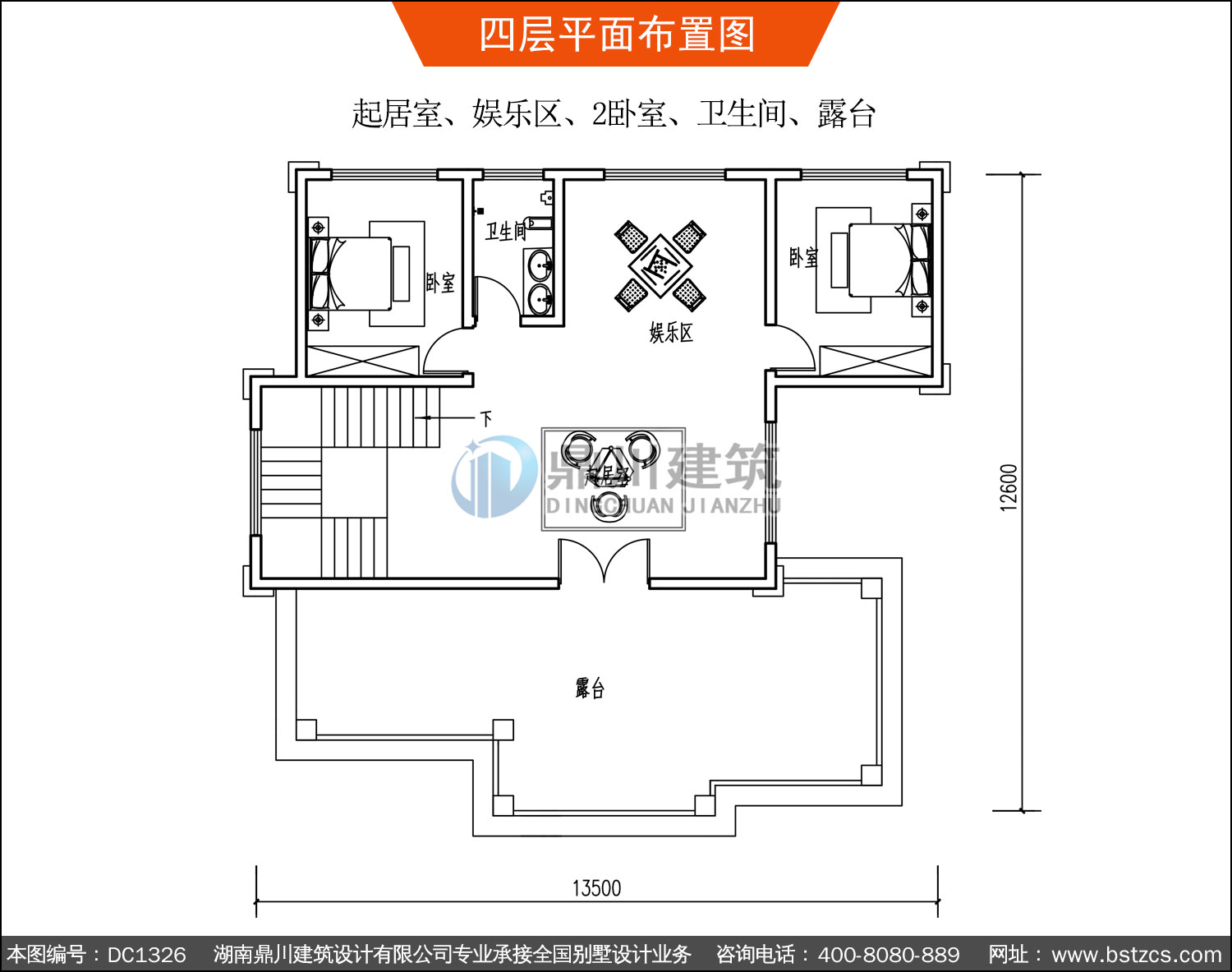 四 層: 起居室、娛樂區(qū)、2臥室、衛(wèi)生間、露臺