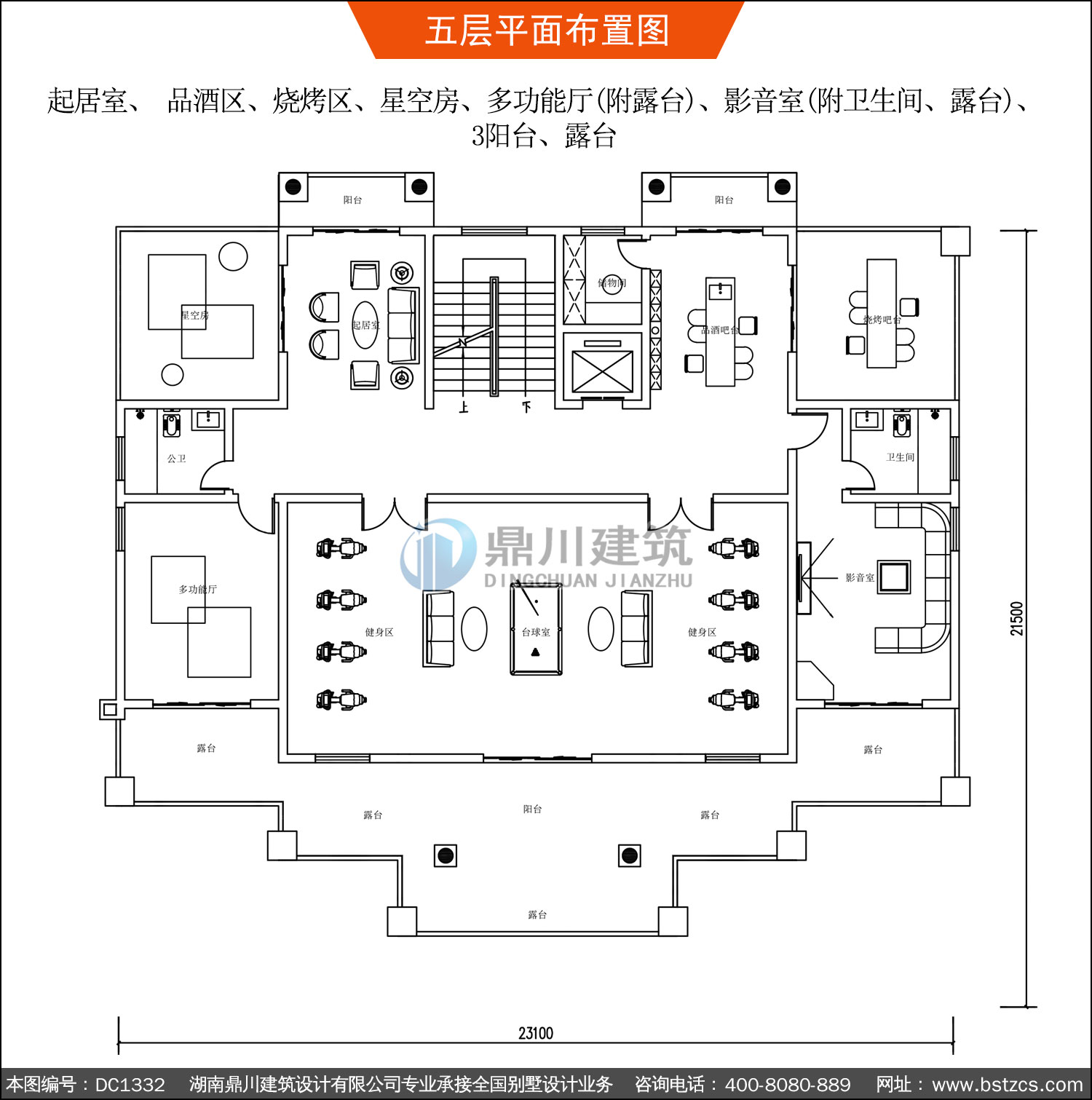 | 五 層: | 起居室、 品酒區(qū)、燒烤區(qū)、星空房、多功能廳(附露臺)、影音室(附衛(wèi)生間、露臺)、 3陽臺、露臺 | |||