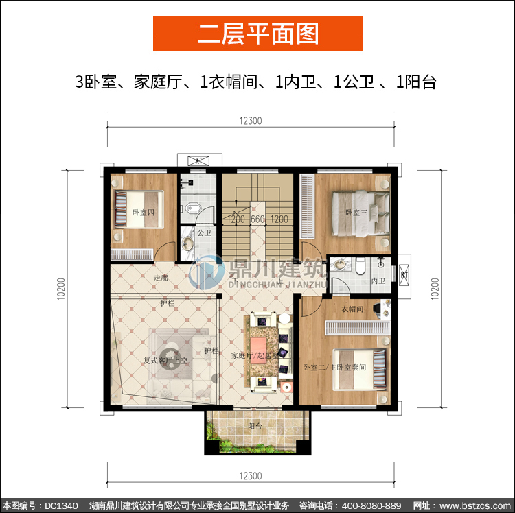 二 層: 3臥室、家庭廳、1衣帽間、1內(nèi)衛(wèi)、1公衛(wèi)、1陽臺(tái)