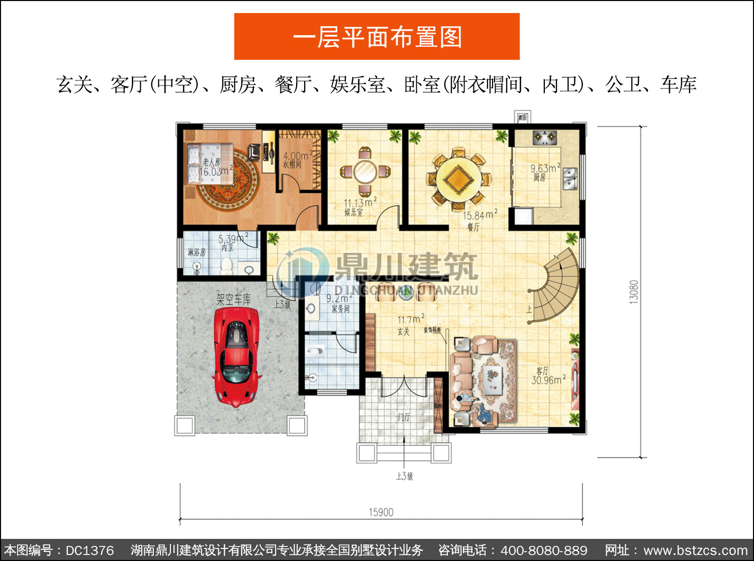 一 層: 玄關、客廳(中空)、廚房、餐廳、娛樂室、臥室(附衣帽間、內衛(wèi))、公衛(wèi)、車庫