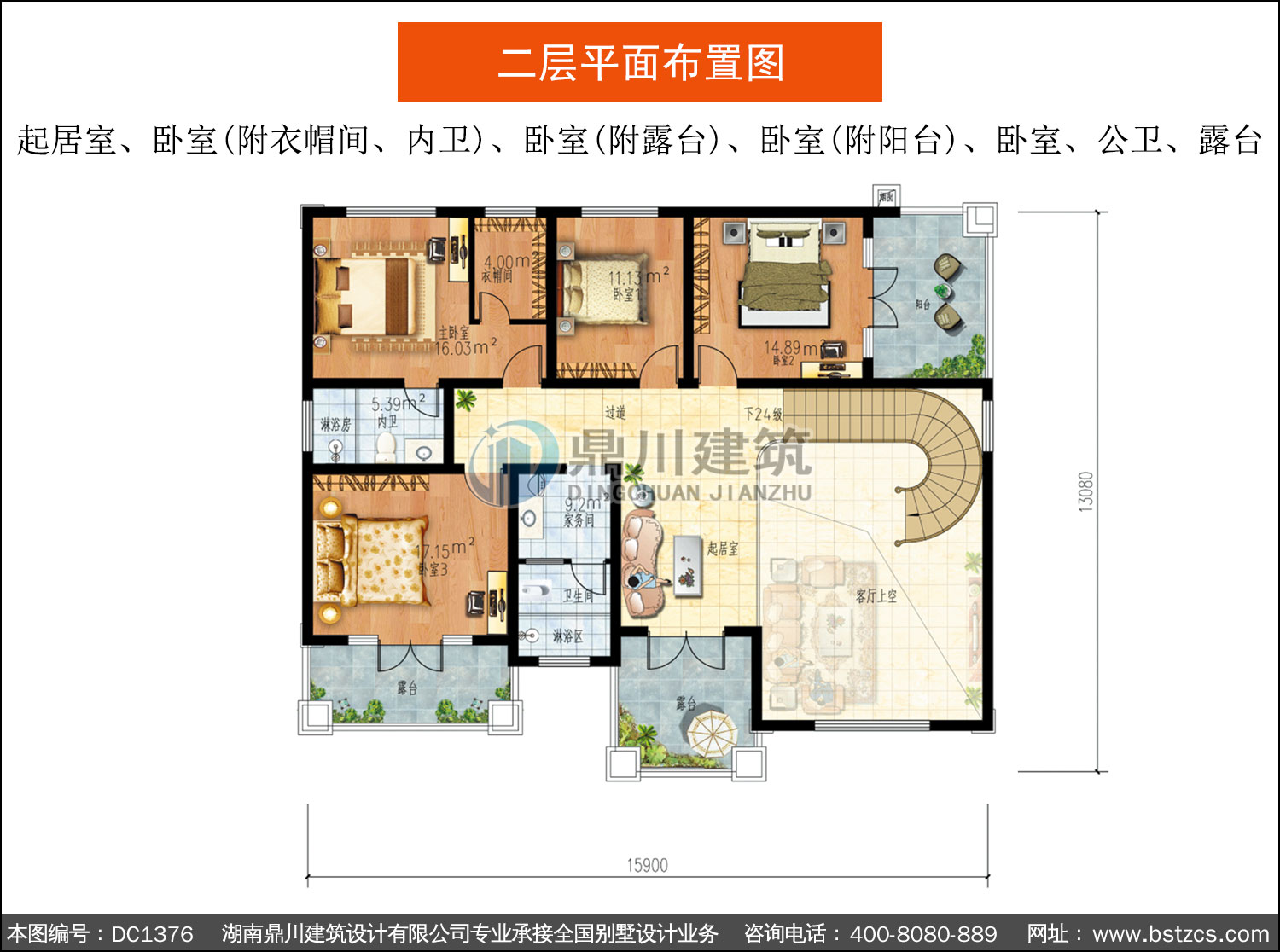 二 層: 起居室、臥室(附衣帽間、內衛(wèi))、臥室(附露臺)、臥室(附陽臺)、臥室、公衛(wèi)、露臺
