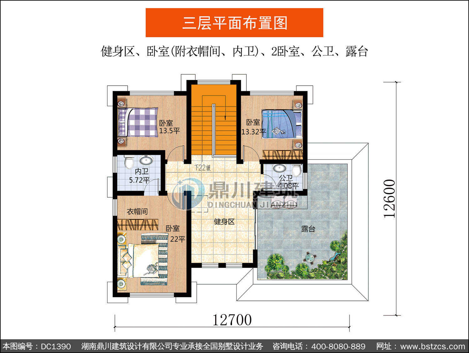 | 三 層: | 健身區(qū)、臥室(附衣帽間、內(nèi)衛(wèi))、2臥室、公衛(wèi)、露臺 | |||