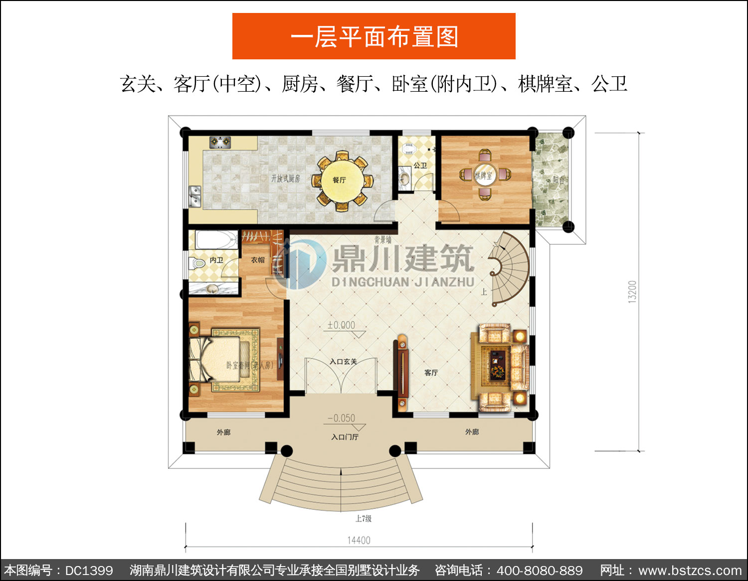 一 層: 玄關(guān)、客廳(中空)、廚房、餐廳、臥室(附內(nèi)衛(wèi))、棋牌室、公衛(wèi)