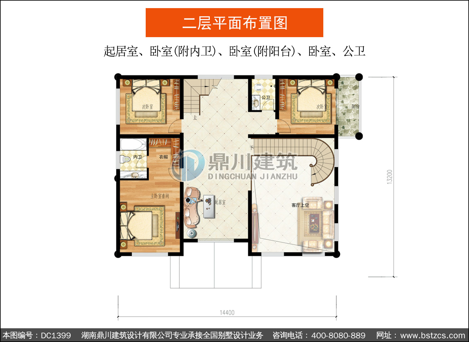 二 層: 起居室、臥室(附內(nèi)衛(wèi))、臥室(附陽臺(tái))、臥室、公衛(wèi)
