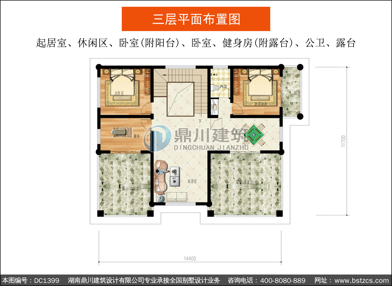 三 層: 起居室、休閑區(qū)、臥室(附陽臺(tái))、臥室、健身房(附露臺(tái))、公衛(wèi)、露臺(tái)