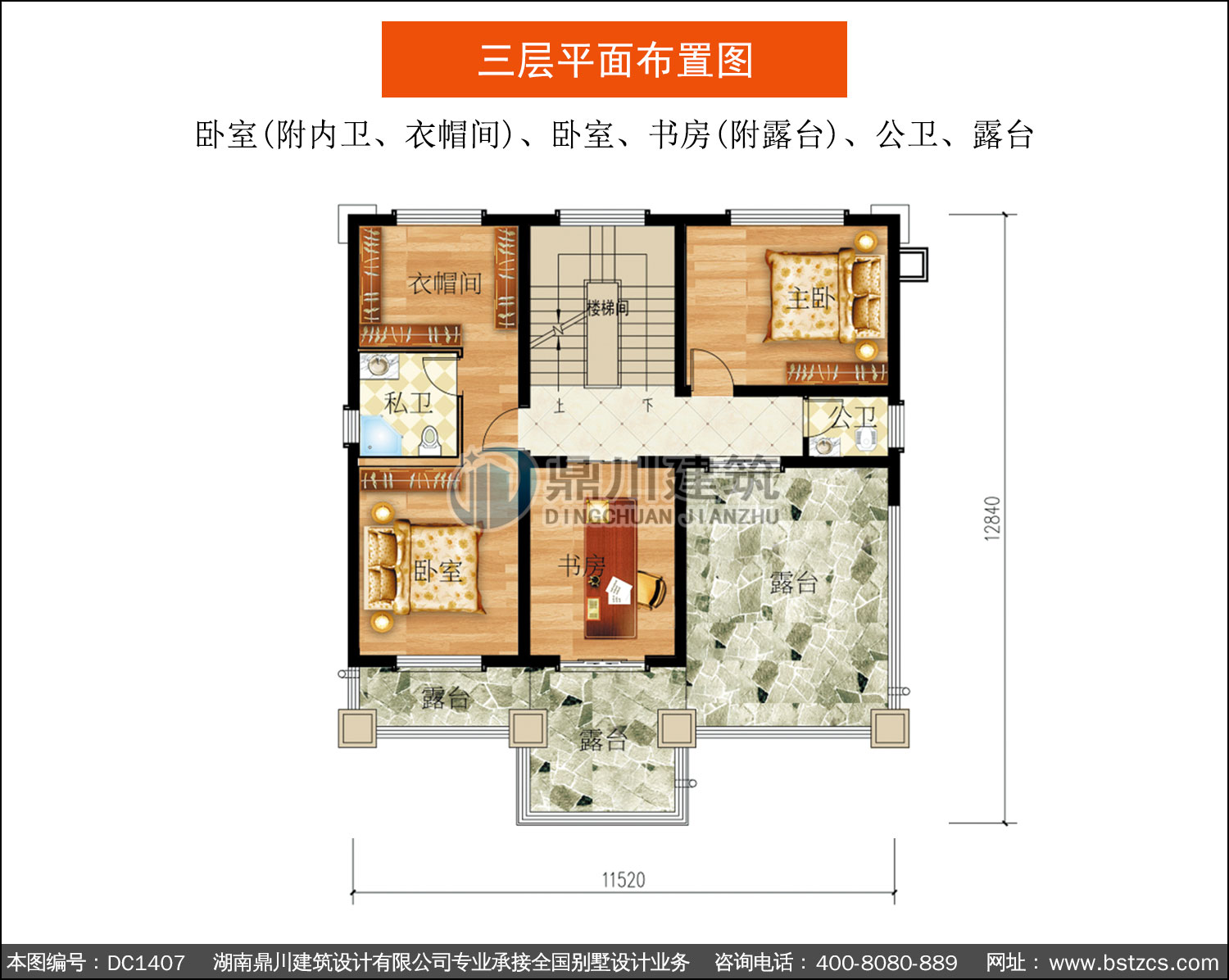 | 三 層: | 臥室(附內(nèi)衛(wèi)、衣帽間)、臥室、書房(附露臺)、公衛(wèi)、露臺 | |||