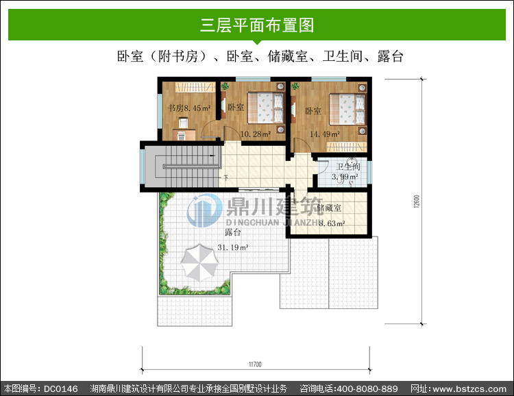 | 三 層: | 臥室(附書房)、臥室、儲藏室、衛(wèi)生間、露臺 | |||