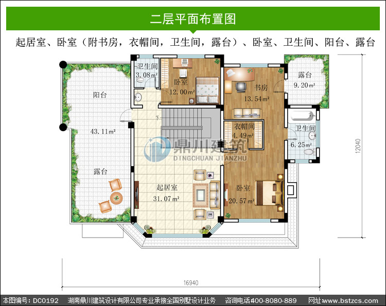 二 層: 起居室、臥室(附書(shū)房,衣帽間,衛(wèi)生間,露臺(tái))、臥室、衛(wèi)生間、陽(yáng)臺(tái)、露臺(tái)