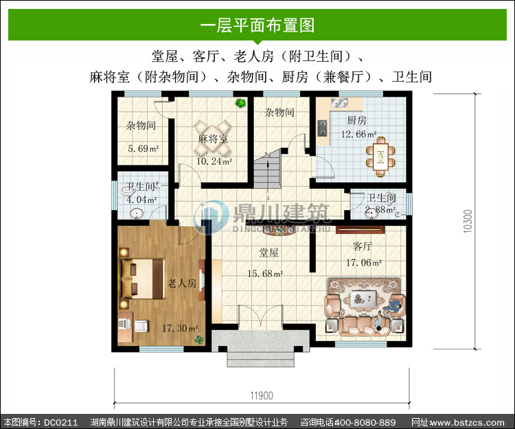 | 一 層: | 堂屋、客廳、老人房(附衛(wèi)生間)、麻將室(附雜物間)、雜物間、廚房(兼餐廳)、衛(wèi)生間 | |||