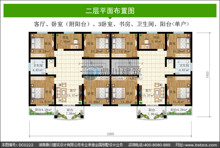 二 層: 客廳、臥室(附陽臺)、3臥室、書房、衛(wèi)生間、陽臺