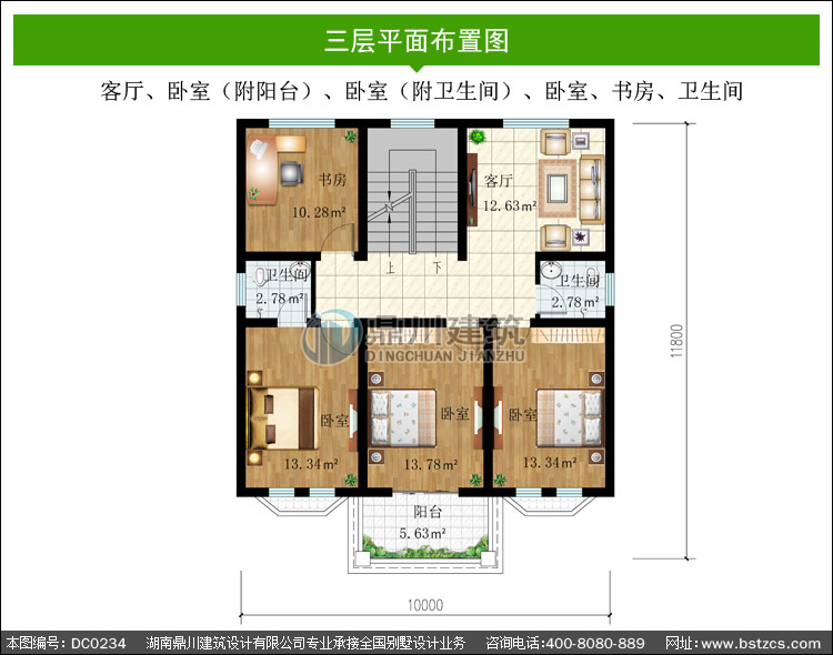 | 三 層: | 客廳、臥室(附陽臺)、臥室(附衛(wèi)生間)、臥室、書房、衛(wèi)生間 | |||