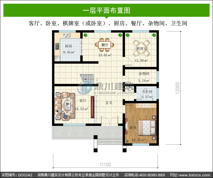 | 一 層: | 客廳、臥室、棋牌室(或臥室)、廚房、餐廳、雜物間、衛(wèi)生間 | |||