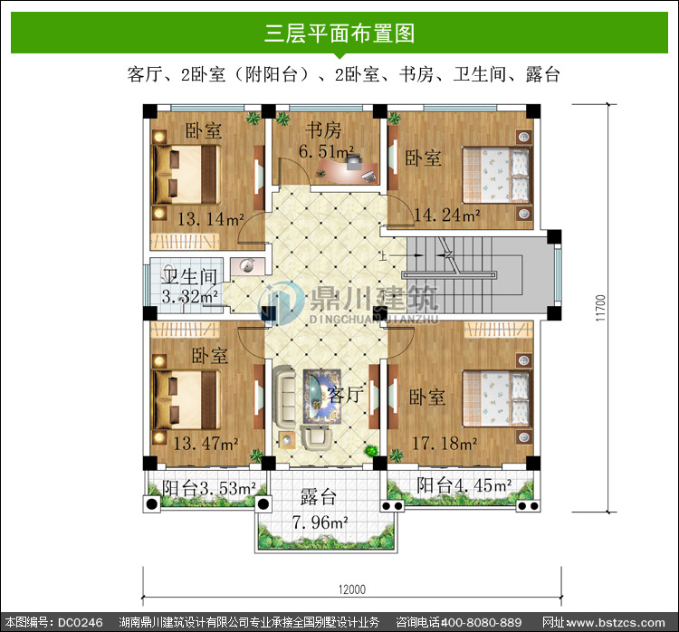 | 三 層: | 客廳、2臥室(附陽(yáng)臺(tái))、2臥室、書房、衛(wèi)生間、露臺(tái) | |||
