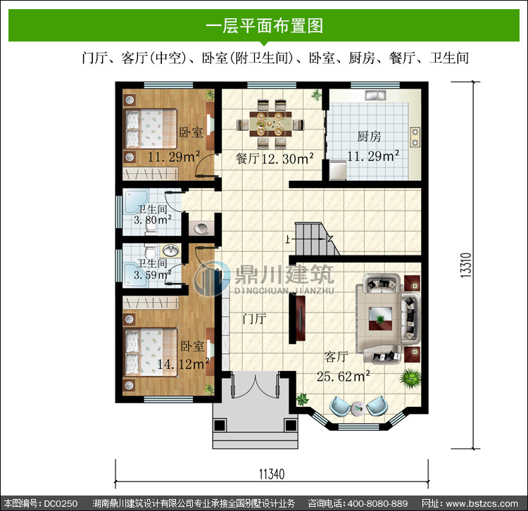 | 一 層: | 門廳、客廳(中空)、臥室(附衛(wèi)生間)、臥室、廚房、餐廳、衛(wèi)生間 | |||