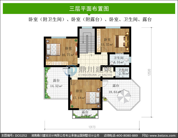 三 層: 臥室(附衛(wèi)生間)、臥室(附露臺(tái))、臥室、衛(wèi)生間、露臺(tái)