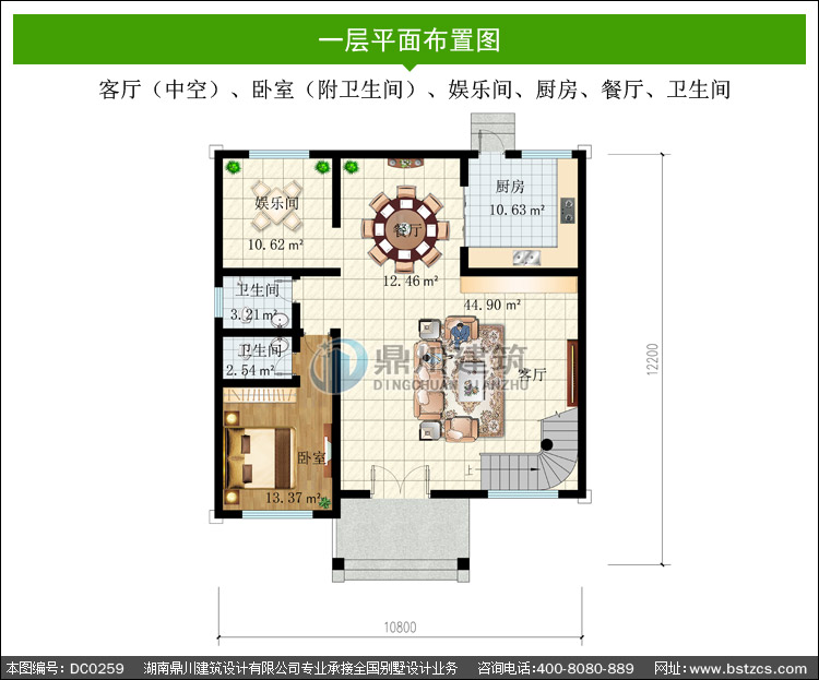 | 一 層: | 客廳(中空)、臥室(附衛(wèi)生間)、娛樂間、廚房、餐廳、衛(wèi)生間 | |||