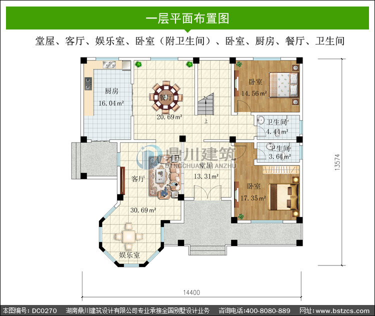 | 一 層: | 堂屋、客廳、娛樂室、臥室(附衛(wèi)生間)、臥室、廚房、餐廳、衛(wèi)生間 | |||