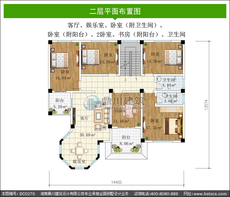 | 二 層: | 客廳、娛樂室、臥室(附衛(wèi)生間)、臥室(附陽臺(tái))、2臥室、書房(附陽臺(tái))、衛(wèi)生間 | |||