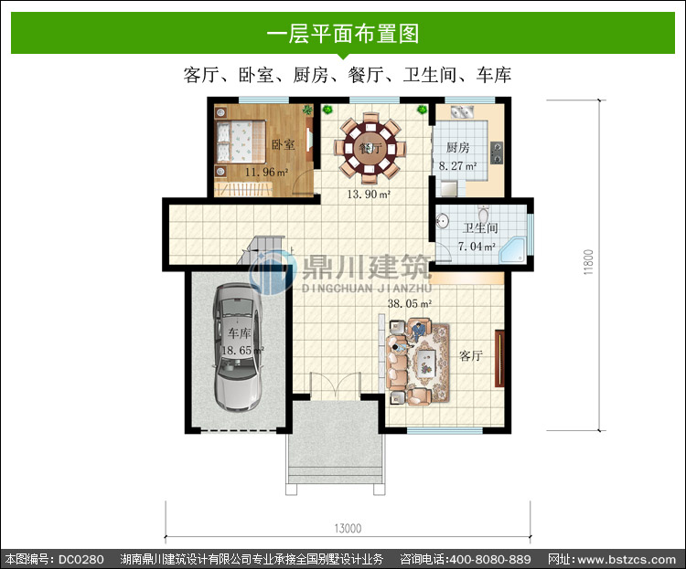 | 一 層: | 客廳、臥室、廚房、餐廳、衛(wèi)生間、車庫(kù) | |||