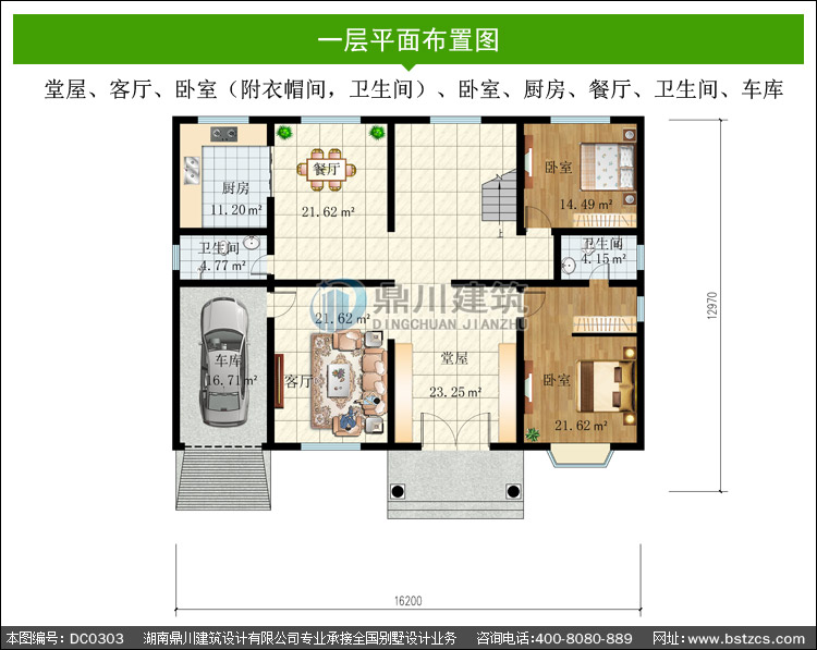 | 一 層: | 堂屋、客廳、臥室(附衣帽間,衛(wèi)生間)、臥室、廚房、餐廳、衛(wèi)生間、車庫 | |||