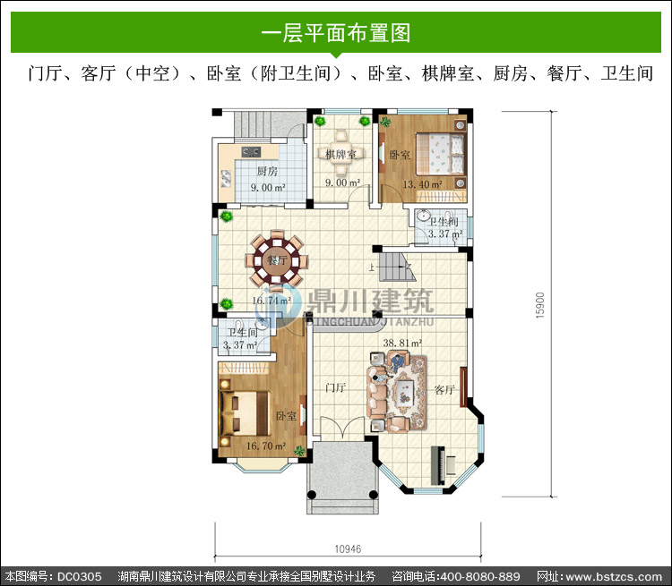| 一 層: | 門廳、客廳(中空)、臥室(附衛(wèi)生間)、臥室、棋牌室、廚房、餐廳、衛(wèi)生間 | |||
