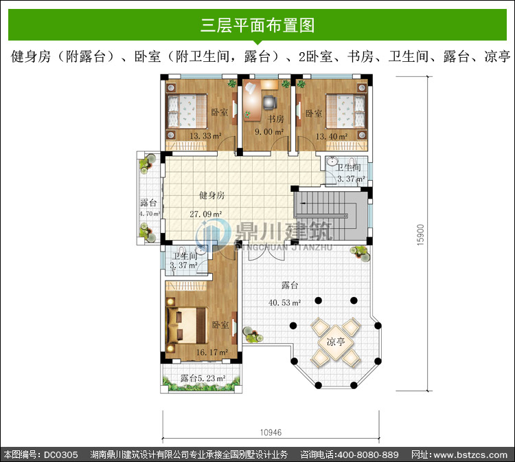 | 三 層: | 健身房(附露臺)、臥室(附衛(wèi)生間,露臺)、2臥室、書房、衛(wèi)生間、露臺、涼亭 | |||