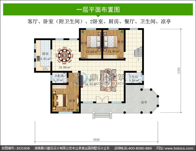 | 一 層: | 客廳、臥室(附衛(wèi)生間)、2臥室、廚房、餐廳、衛(wèi)生間、涼亭 | |||