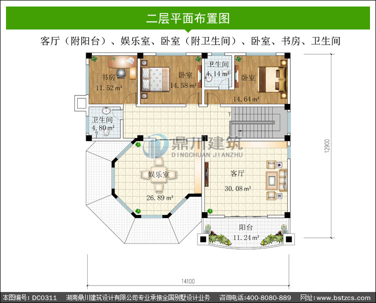 | 二 層: | 客廳(附陽(yáng)臺(tái))、娛樂(lè)室、臥室(附衛(wèi)生間)、臥室、書(shū)房、衛(wèi)生間 | |||