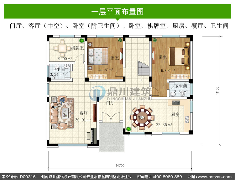 | 一 層: | 門(mén)廳、客廳(中空)、臥室(附衛(wèi)生間)、臥室、棋牌室、廚房、餐廳、衛(wèi)生間 | |||