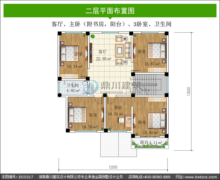 | 二 層: | 客廳、主臥(附書房,陽臺)、3臥室、衛(wèi)生間 | |||