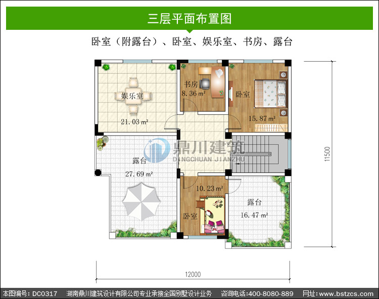 | 三 層: | 臥室(附露臺)、臥室、娛樂室、書房、露臺 | |||