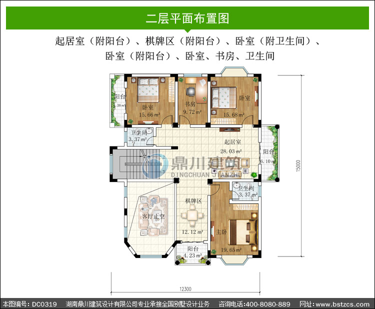 | 二 層: | 起居室(附陽臺)、棋牌區(qū)(附陽臺)、臥室(附衛(wèi)生間)、臥室(附陽臺)、臥室、書房、衛(wèi)生間 | |||