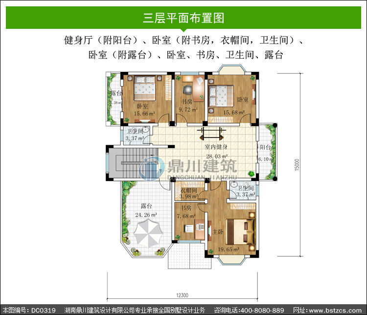 | 三 層: | 健身廳(附陽臺)、臥室(附書房,衣帽間,衛(wèi)生間)、臥室(附露臺)、臥室、書房、衛(wèi)生間、露臺 | |||