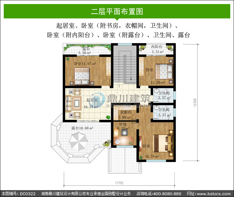 | 二 層: | 起居室、臥室(附書房,衣帽間,衛(wèi)生間)、臥室(附內(nèi)陽臺)、臥室(附露臺)、衛(wèi)生間、露臺 | |||