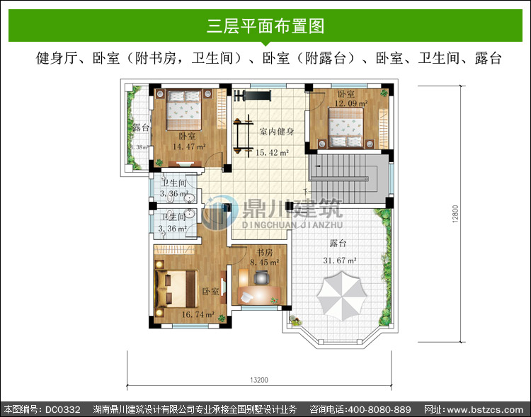 | 三 層: | 健身廳、臥室(附書房,衛(wèi)生間)、臥室(附露臺(tái))、臥室、衛(wèi)生間、露臺(tái) | |||
