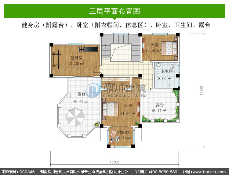 | 三 層: | 健身房(附露臺(tái))、臥室(附衣帽間,休息區(qū))、臥室、衛(wèi)生間、露臺(tái) | |||