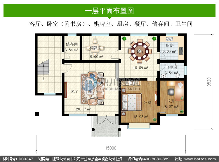 | 一 層: | 客廳、臥室(附書房)、棋牌室、廚房、餐廳、儲(chǔ)存間、衛(wèi)生間 | |||