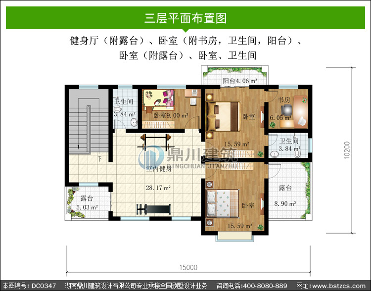 | 三 層: | 健身廳(附露臺(tái))、臥室(附書房,衛(wèi)生間,陽臺(tái))、臥室(附露臺(tái))、臥室、衛(wèi)生間 | |||