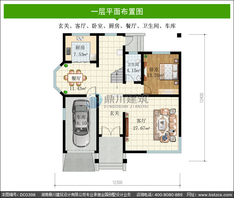 一 層: 玄關(guān)、客廳、臥室、廚房、餐廳、衛(wèi)生間、車庫