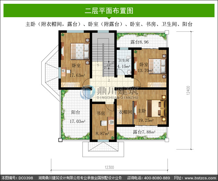 二 層: 主臥(附衣帽間,露臺)、臥室(附露臺)、臥室、書房、衛(wèi)生間、陽臺
